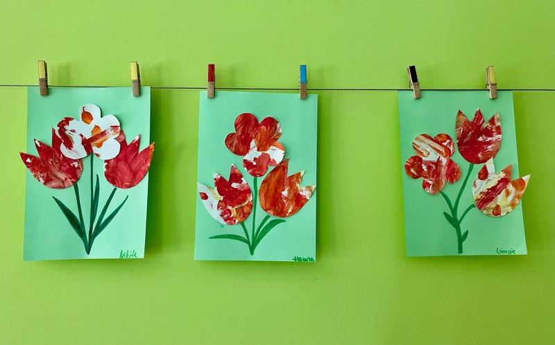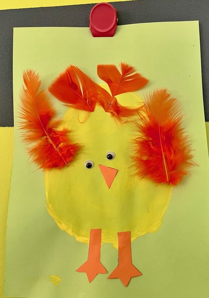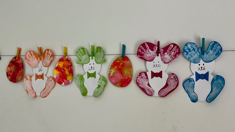 Wir gestalteten Osterhasen aus Hand- und Fußabdrücken, bunte Ostereier und mit Federn beklebte Küken, ebenso wie bunte Frühlingsblumen.